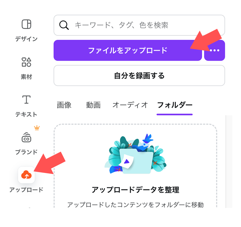 ②Canvaのファイルを開き、素材をアップロード